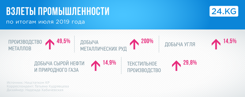 По данным Национального статистического комитета, рост объемов промышленного производства в январе — июле 2019 года обусловлен увеличением добычи металлических руд, производства основных металлов и текстиля, добычи сырой нефти, природного газа и угля.
