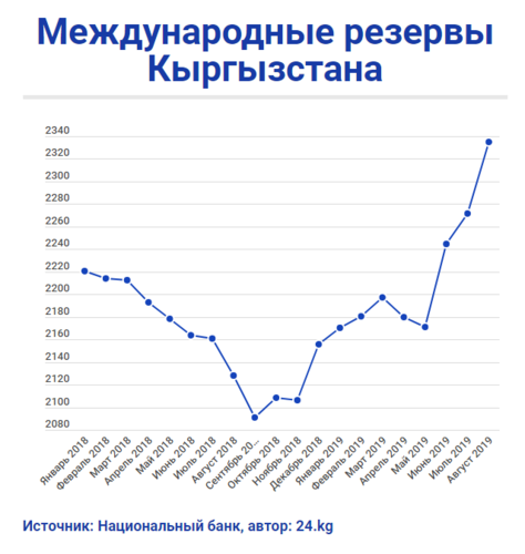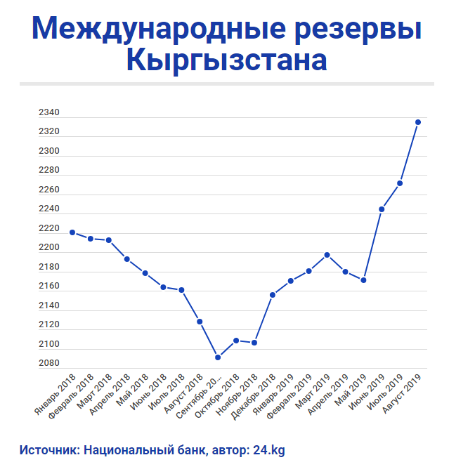 По итогам августа резервы сложились в сумме $2 миллиарда 335,79 миллиона. С начала года они выросли на $180,33 миллиона, а по сравнению с августом 2018-го — на $207,95 миллиона.