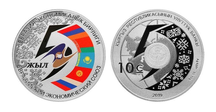 С 24 сентября 2019 года Национальный банк Кыргызстана ввел в обращение серебряную коллекционную монету «5 лет Евразийскому экономическому союзу» серии «Исторические события». Об этом сообщила пресс-служба ЕАЭС.
