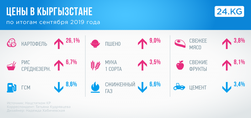 «Инфляция ускоряется, но остается ниже целевого ориентира Национального банка Кыргызстана в 5-7 процентов. В сентябре 2019 года рост потребительских цен увеличился до 2,3 процента (2 процента месяцем ранее). Продовольственная инфляция продолжила расти на фоне повышения импортных цен на зерновые. Ограниченное предложение картофеля (годом ранее — перепроизводство) сказалось на увеличении цен плодоовощной продукции. Дополнительное влияние на инфляцию оказывает подорожание алкогольных напитков и табака», — заключила Айгуль Бердигулова.
