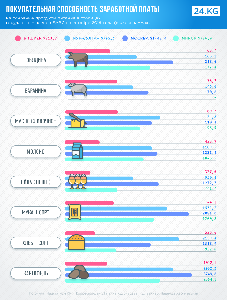 В сентябре 2019 года на среднюю зарплату меньше всего продуктов среди столиц стран ЕАЭС можно было купить именно в Бишкеке. Например, в столице Кыргызстана на среднюю зарплату можно приобрести почти в 3 раза продуктов меньше, чем в Москве. Самый большой разрыв отмечается в возможности покупки на зарплату яиц — 3,88 раза, а самый наименьший в покупке сливочного масла — 1,58 раза.