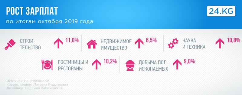 Наиболее значительное повышение среднемесячной заработной платы наблюдалось в строительстве (11 процентов), сфере профессиональной, научной и технической деятельности (10,8 процента), деятельности гостиниц и ресторанов (10,2 процента), добычи полезных ископаемых (9 процентов), водоснабжения, очистки, обработки отходов и получения вторичного сырья (7,9 процента), операций с недвижимым имуществом (6,5 процента).