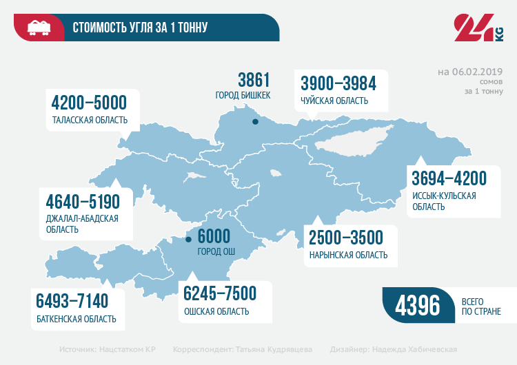 Дороже всего твердое топливо в Ноокате (7,5 тысячи сомов за тонну), Баткене (7 тысяч 140,04), Исфане (6 тысяч 493,07) и Кара-Суу (6 тысяч 245).