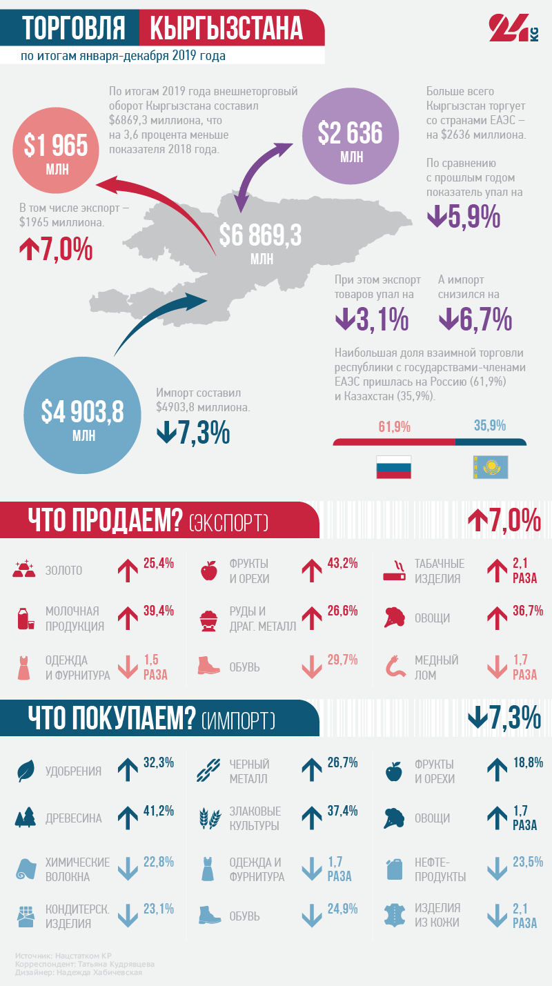 По итогам 2019 года внешнеторговый оборот Кыргызстана составил $6 миллиардов 869,3 миллиона, что на 3,6 процента меньше показателя 2018-го. Экспорт — $1 миллиард 965,5 миллиона (рост — на 7 процентов), импорт — $4 миллиарда 903,8 миллиона (падение — на 7,3 процента).