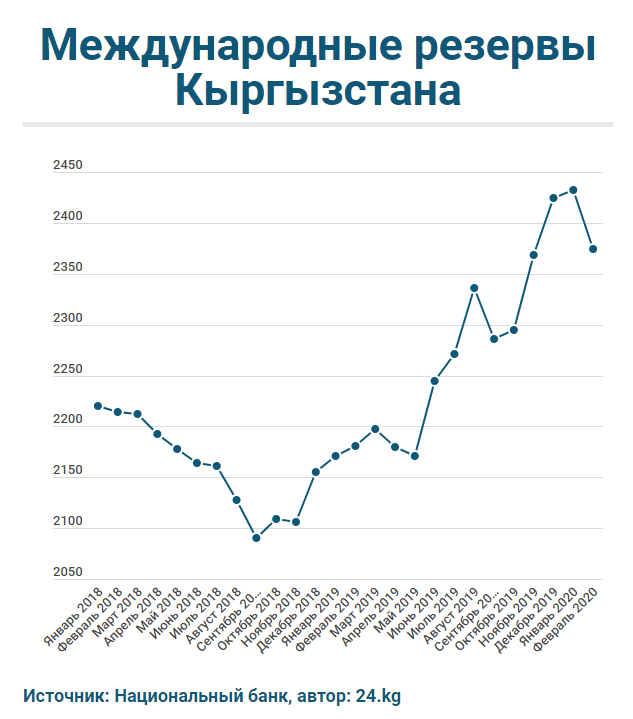 Отмечается, что по итогам февраля 2020 года резервы составили $2 миллиарда 374,05 миллиона. Это на $57,83 миллиона меньше, чем месяцем ранее. Связано это с тем, что в феврале Национальный банк провел две интервенции, продав на валютном рынке $55,5 миллиона. По сравнению с февралем 2019 года показатель вырос на 193,56 миллиона.