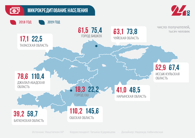 Больше всего кредитов получили жители Ошской области (21 процент общего объема выданных микрокредитов), Бишкека (19,2 процента), Джалал-Абадской (14 процентов) и Чуйской (13,9 процента) областей.