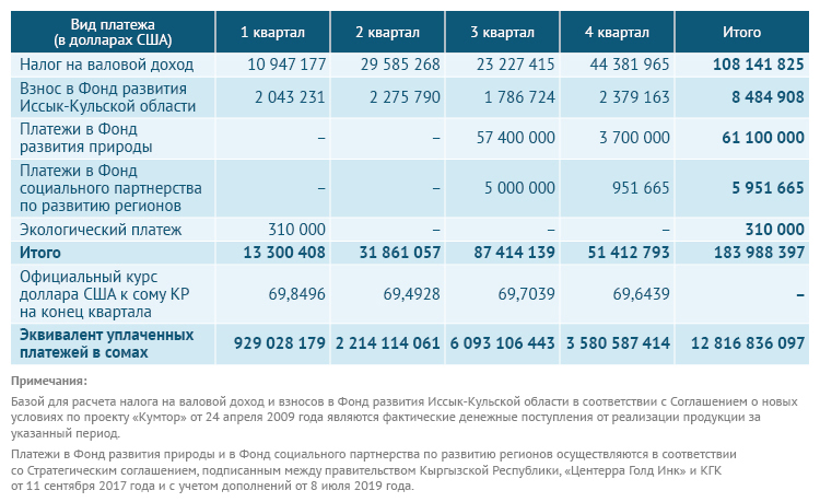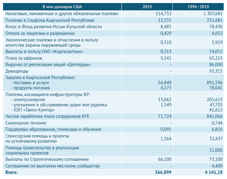 Всего за период работы компании с 1994 по 2019 год выплаты на территории Кыргызстана превысили $4 миллиарда 141 миллион.