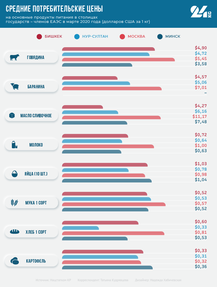 В марте 2020 года максимальные средние цены на товары первой необходимости по сравнению с остальными столицами стран ЕАЭС, за исключением картофеля, зафиксировали в Москве. Самым дорогим картофель был в Минске ($0,36), а самым дешевым — в Нур-Султане ($0,31).