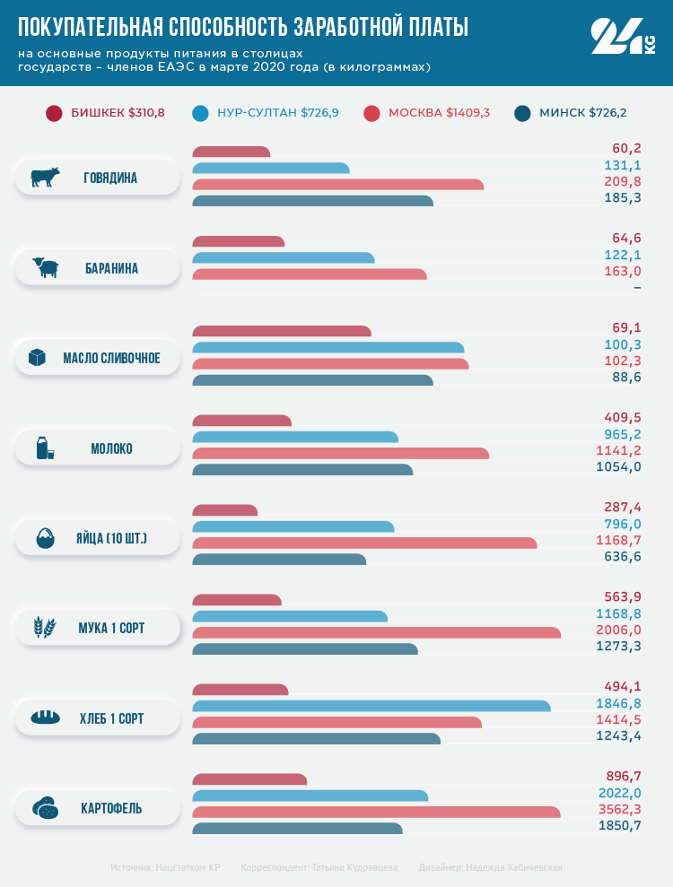 В марте этого года уровень средних розничных цен на пастеризованное молоко по Бишкеку был выше, чем в Нур-Султане, на 11,1 процента и Минске — на 12,5 процента. Говядина в столице Беларуси на 26,9 процента дешевле бишкекской. Цены на хлеб в столице Кыргызстана были на 45 процентов выше, чем в Нур-Султане, и на 11,7 процента — в Минске. Средние цены на яйца в Бишкеке были выше, чем в столице Казахстана, на 24,3 процента.Сравнительный анализ покупательной способности среднемесячной заработной платы показал, что в феврале 2020 года она по продуктам первой необходимости в Бишкеке отставала от столиц государств ЕАЭС. Это связано в первую очередь с низким размером зарплаты в столице Кыргызстана.