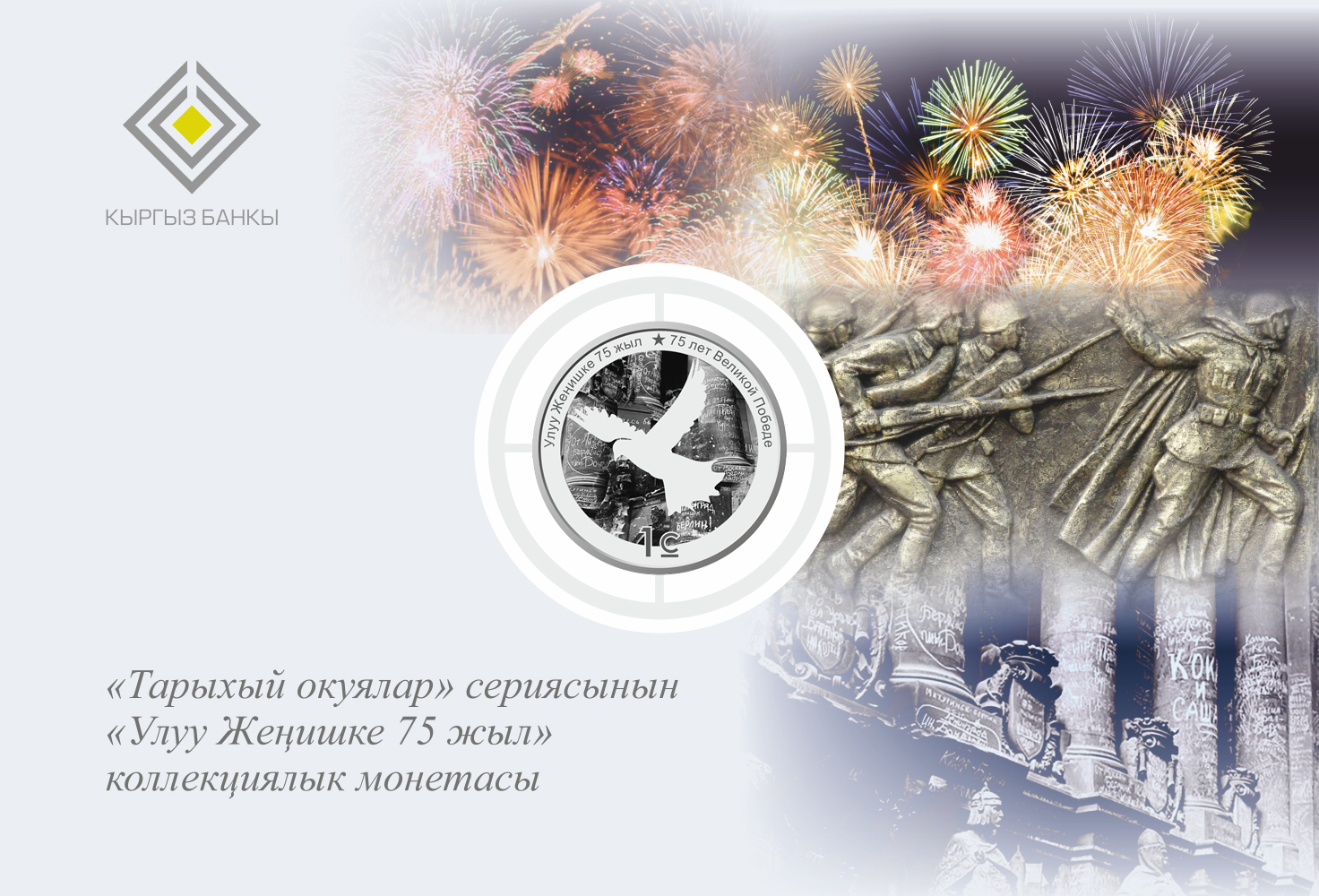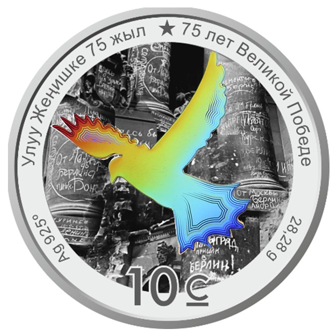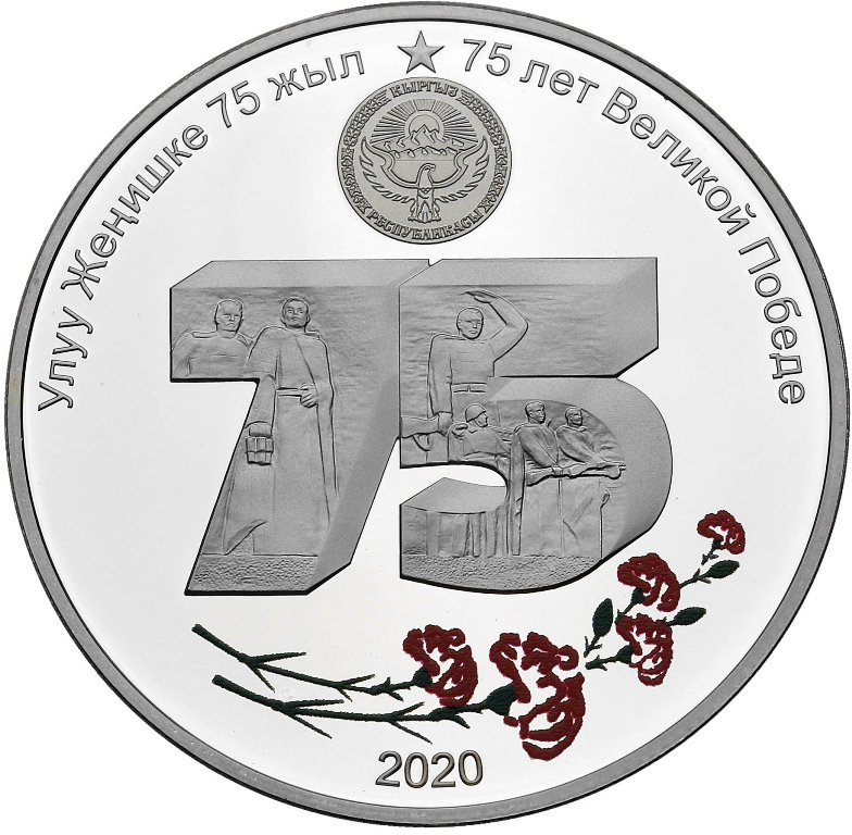 Серебряная монета «75 лет Великой Победе» выпущена тиражом 14 тысяч экземпляров и стоит 3 тысячи 270 сомов. Медно-никелевых монет «75 лет Великой Победе» выпущено 5 тысяч штук, и стоят они 425 сомов. Монет «Народной Апрельской революции — 10 лет» выпущено только 1 тысяча штук. Стоит она 825 сомов.