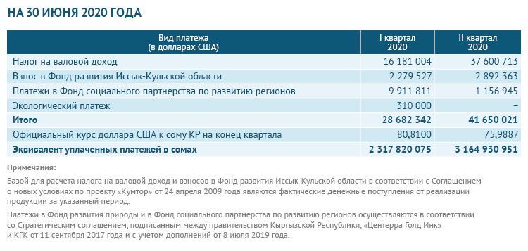 В первом полугодии 2020 года на «Кумторе» произвели 325 тысяч 551 унцию, или 10 тонн 125,77 килограмма золота. С начала года компания перечислила налогов и обязательных платежей на сумму более 6,46 миллиарда сомов, сообщил отдел по связям со СМИ «Кумтор Голд Компани».
