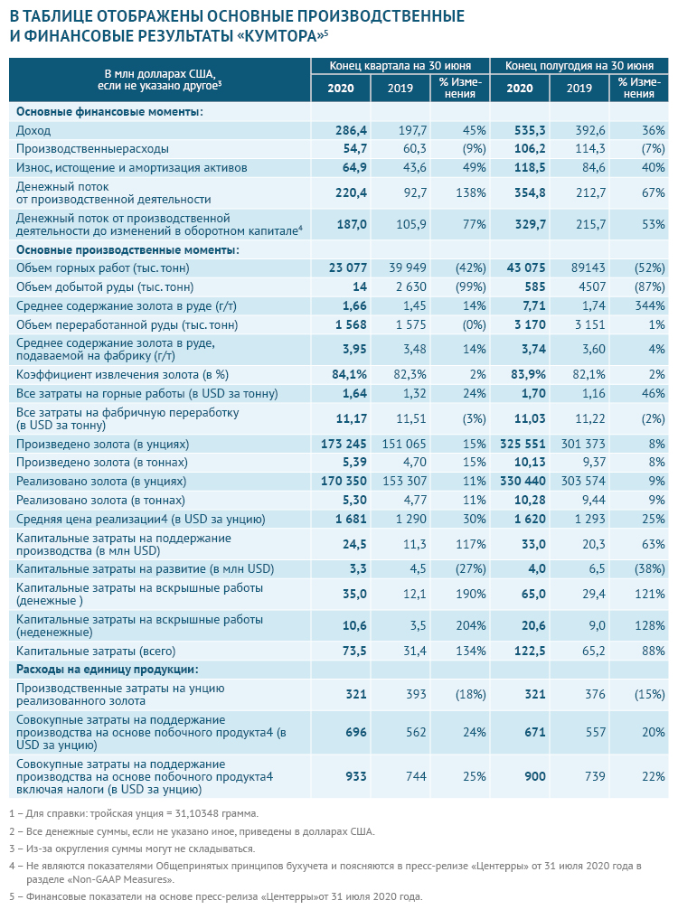 Объем производства золота на «Кумторе» во втором квартале 2020 года составил 173 тысячи 245 унций золота, тогда как в аналогичном квартале 2019-го — 151 тысячу 65 унций.