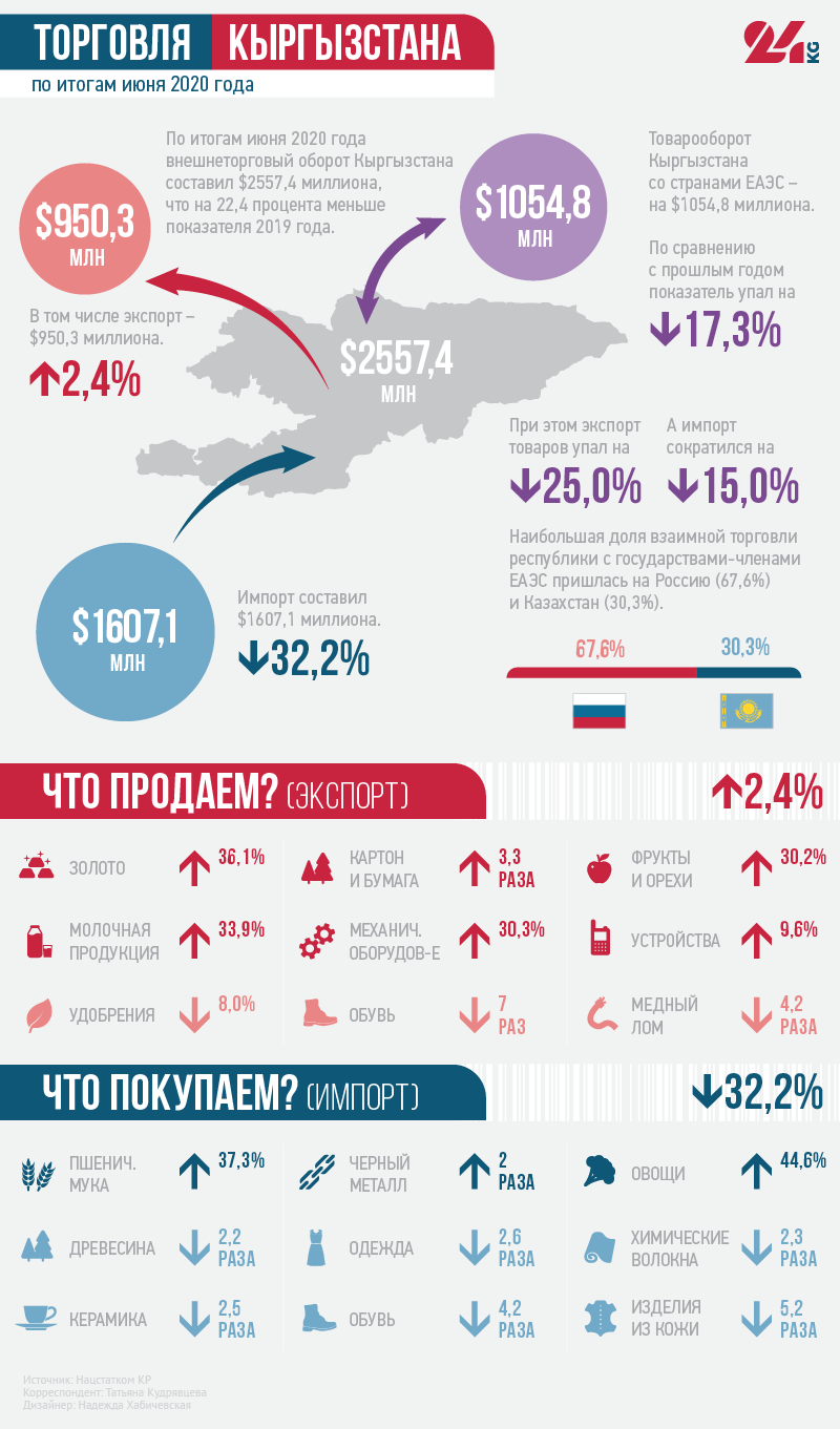 По итогам июня внешнеторговый оборот Кыргызстана составил $2 миллиарда 557,4 миллиона, что на 22,4 процента меньше показателя 2019-го. Экспорт — $950,3 миллиона (рост на 2,4 процента), импорт — $1 миллиард 607,1 миллиона (падение на 32,2 процента).