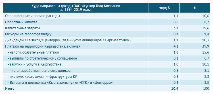 Если пересчитать это в сомах по текущему курсу, то 347 миллиардов 844 миллиона сомов попали в экономику Кыргызстана за время работы «Кумтора» в виде налогов, обязательных платежей, выплат по стратегическому соглашению, на закупки товаров у местных производителей, зарплаты сотрудникам (99 процентов граждане Кыргызстана), выплату и дивиденды «Кыргызалтыну», платежи на инфраструктуру.