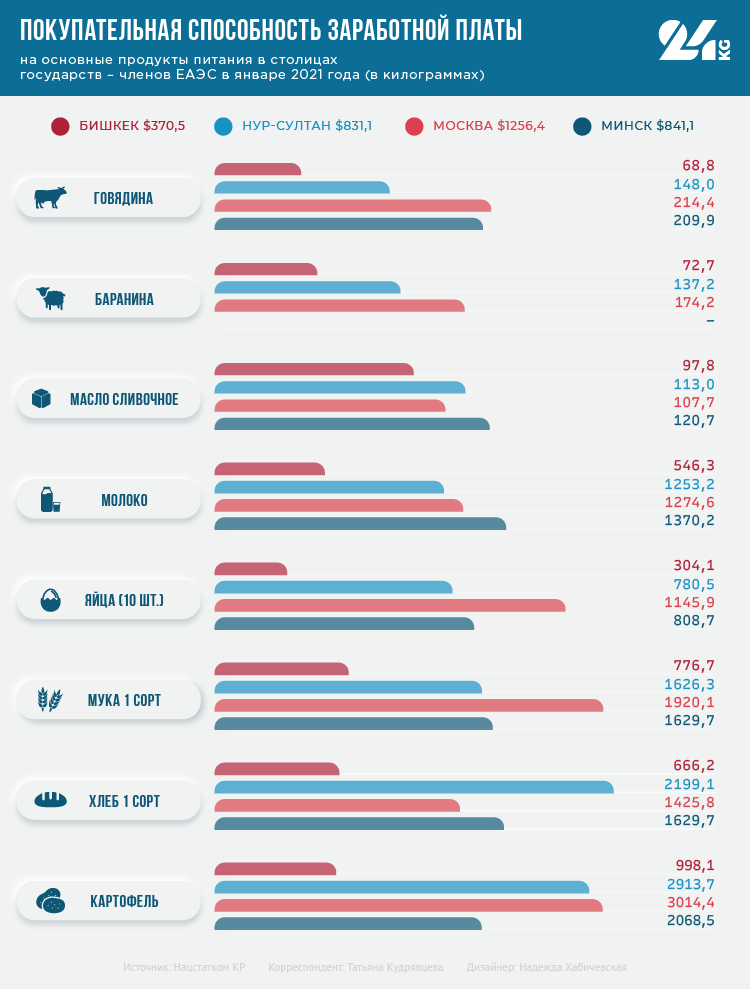 На бишкекскую зарплату можно купить почти в 2,5 раза меньше продуктов, чем на московскую. Самый большой разрыв — в возможности купить яйца (почти в 4 раза), а самый маленький — сливочное масло (в 1,1 раза).