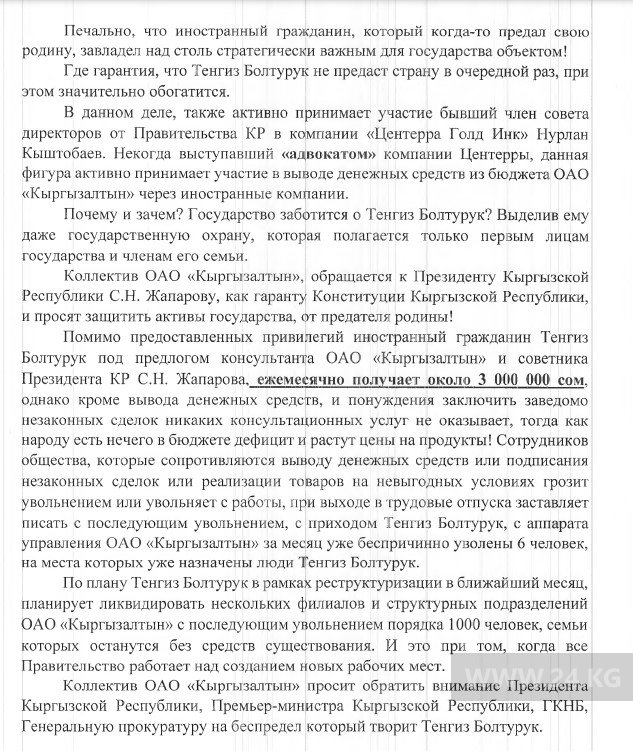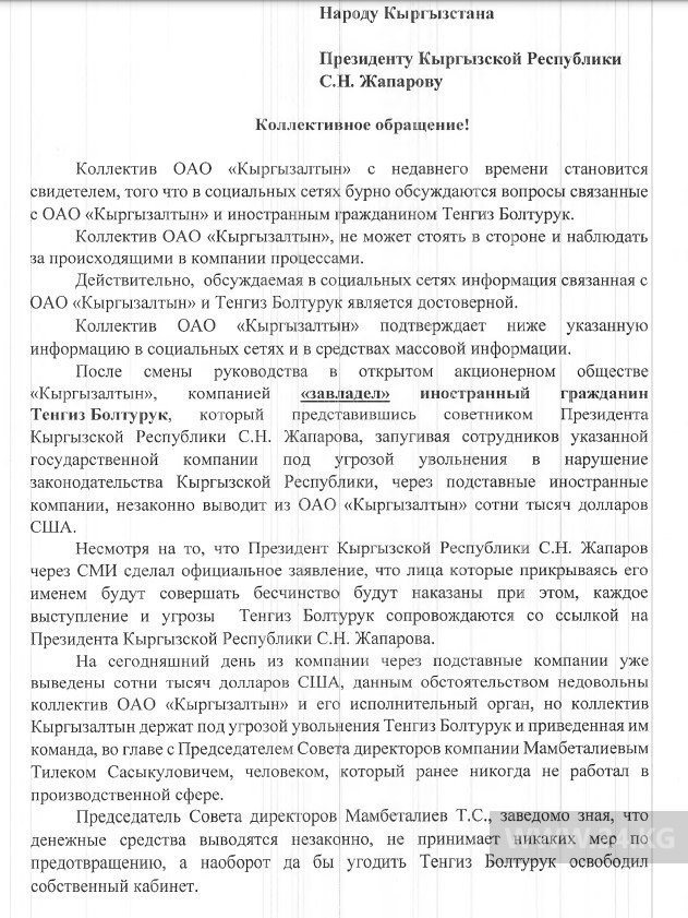 «Нарушая законодательство Кыргызстана, через подставные компании из ОАО «Кыргызалтын» выводят сотни тысяч долларов. Председатель совета директоров Тилек Мамбеталиев, заведомо зная, что денежные средства выводят незаконно, не принимает никаких мер», — говорится в обращении.