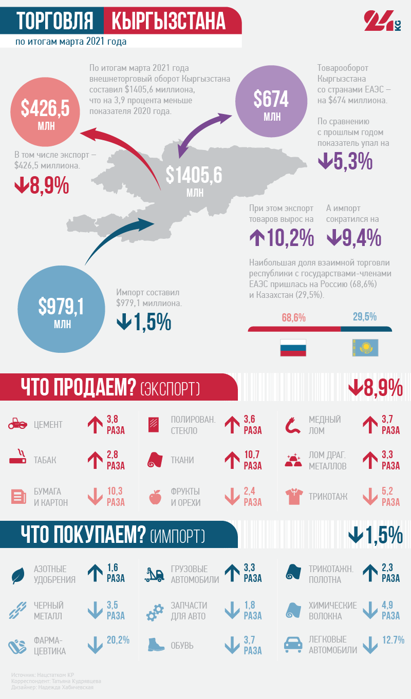 По итогам марта внешнеторговый оборот Кыргызстана составил $1 миллиард 405,6 миллиона, что на 3,9 процента меньше показателя 2020-го. Экспорт — $426,5 миллиона (падение на 8,9 процента), импорт — $979,1 миллиона (падение на 1,5 процента).