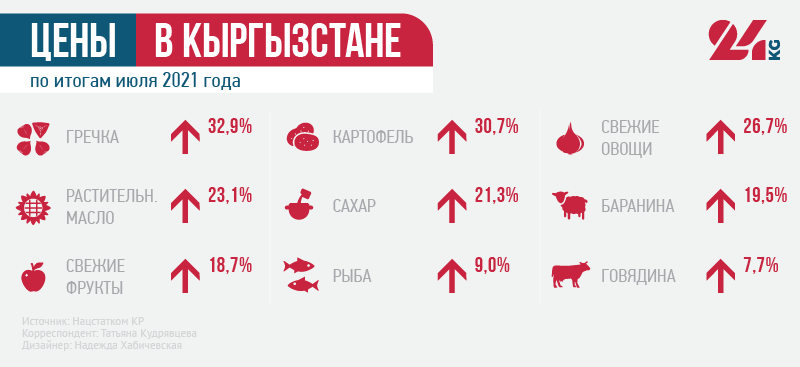 В январе — июле цены выросли во всех регионах республики. Максимально (9,7 процента) — в Баткенской области. Здесь сильно подорожали продукты и безалкогольные напитки (на 13,8 процента), алкоголь и табачные изделия (на 13,6 процента).