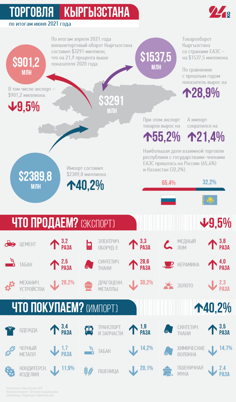 По итогам июня внешнеторговый оборот Кыргызстана составил $3 миллиарда 291 миллион, что на 21,9 процента выше показателя 2020-го. Экспорт — $901,2 миллиона (падение на 9,5 процента), импорт — $2 миллиарда 389,8 миллиона (рост на 40,2 процента).