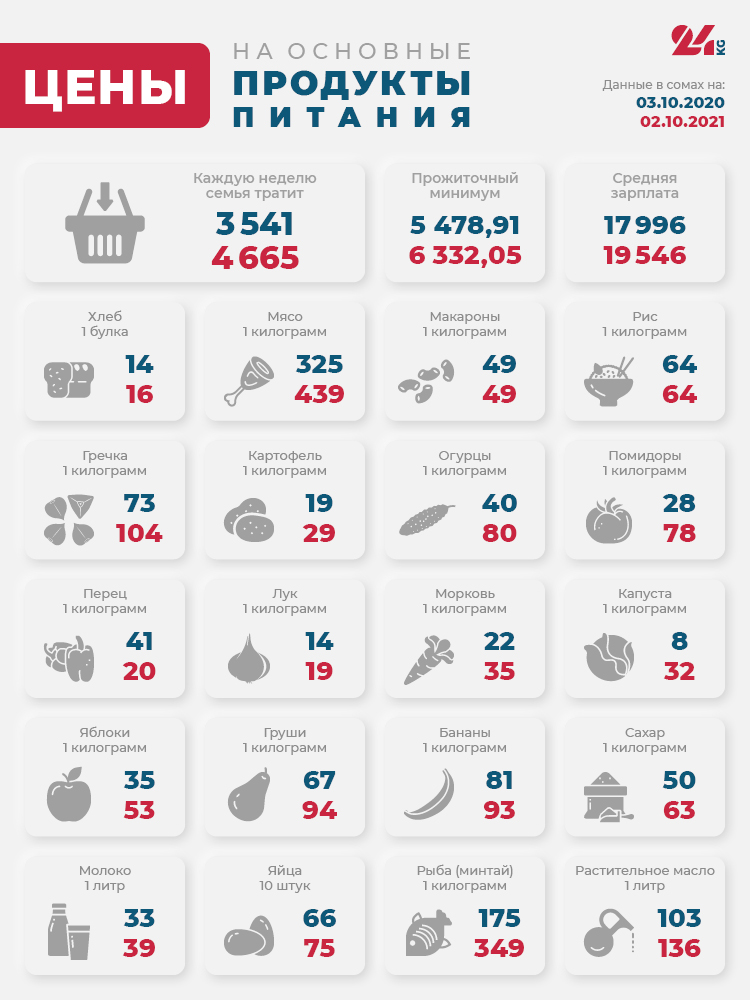 Мы еженедельно ходим в один и тот же супермаркет и отслеживаем цены на один и тот же набор продуктов. Анализ показывает, что по сравнению с октябрем 2020-го стоимость нашей продуктовой корзины выросла на 1 тысячу 124 сома.