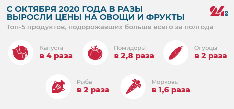 Правда, долго это не продлилось. К концу лета овощ стоил 35 сомов. Такой цена остается и сейчас. Но и остальные продукты, которые традиционно держатся примерно на одном ценовом уровне весь год, стали дорожать. Например, помидоры в октябре 2020-го стоили 28 сомов, а сейчас 78 сомов. На 31 сом дороже стала гречка. Во многом это связано с неурожаем крупы в России.