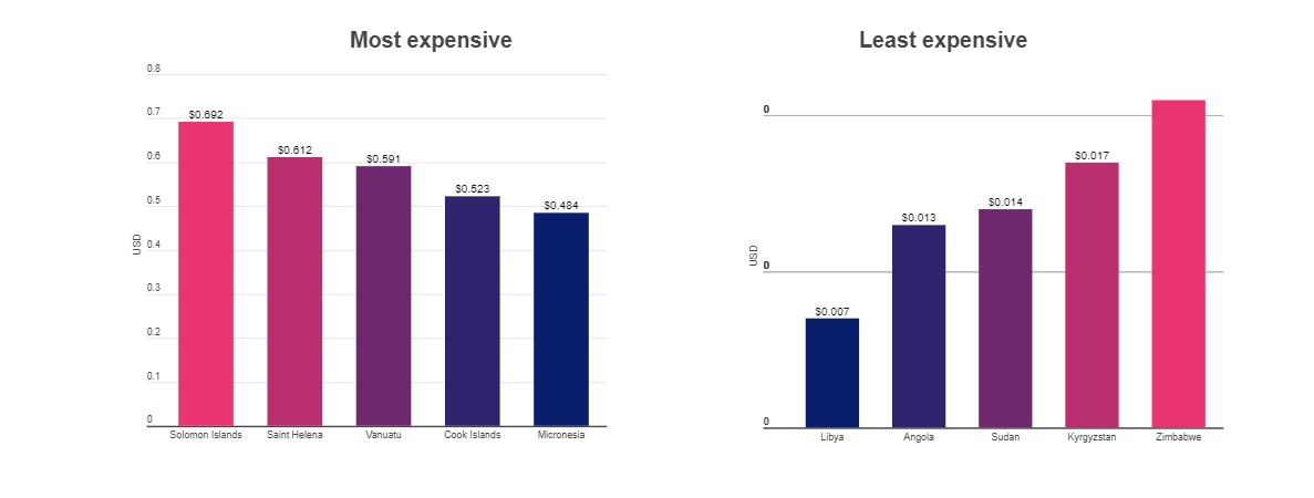Среди соседей Кыргызстана Россия на 22-м месте по дороговизе топлива ($0,05), Казахстан — 16-е место ($0,039), Таджикистан — на 6-м месте ($0,023), Узбекистан — 7-м ($0,027), Армения — на 46-м месте ($0,072) и Беларусь — 40-е место ($0,069).В пятерку стран с самой дорогой электроэнергией в мире входят Соломоновы Острова ($0,692), остров Святой Елены ($0,612), Вануату ($0,591), Острова Кука ($0,523) и Микронезия ($0,484).