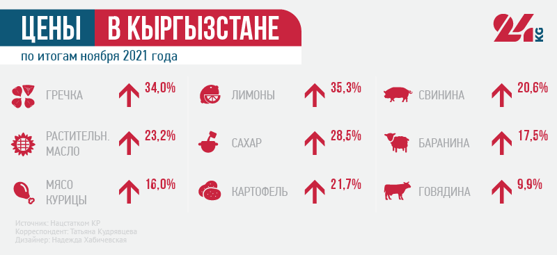 С начала года цены в Кыргызстане выросли на 9,7 процента. Алкоголь и табачные изделия подорожали на 10,8 процента, продукты и безалкогольные напитки — на 11 процентов, непродовольственные товары — на 10 процентов, тарифы на услуги, оказываемые населению, — на 5,1 процента.
