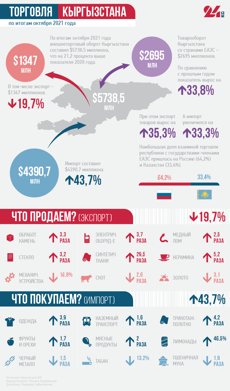 По итогам октября внешнеторговый оборот Кыргызстана составил $5 миллиардов 738,5 миллиона, что на 21,2 процента выше показателя 2020-го. Экспорт — $1 миллиард 347,8 миллиона (падение на 19,7 процента), импорт — $4 миллиарда 390,7 миллиона (рост на 43,7 процента).