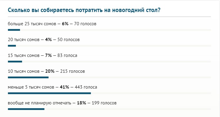 За экономный вариант празднования Нового года высказался 41 процент опрошенных. Еще 18 процентов вообще не планируют отмечать праздник. 20 процентов читателей признались, что на расходы на новогодние праздники заложили больше 10 тысяч сомов. Есть и те, кто собирается отмечать наступающий 2022 год с размахом.