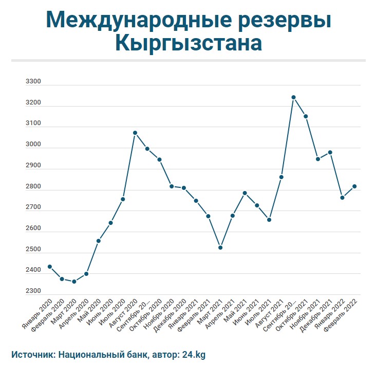 По итогам февраля 2022 года валовые международные резервы Кыргызстана достигли $2 миллиардов 816,07 миллиона. Об этом сообщается на сайте Национального банка.