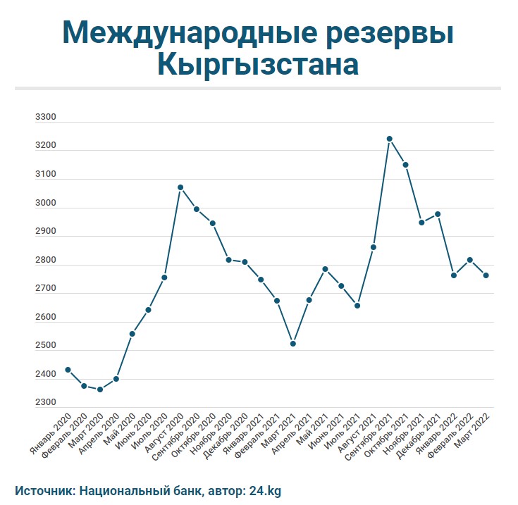 По итогам марта 2022 года валовые международные резервы Кыргызстана достигли $2 миллиардов 761,94 миллиона. Об этом сообщается на сайте Национального банка.