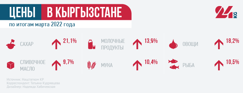 Повышение цен и тарифов по итогам первого квартала года наблюдалось во всех регионах республики. Максимальный рост цен (6 процентов) зафиксировали в Нарынской области. Там сильно подорожал алкоголь и табачные изделия (на 15,8 процента).В марте 2022 года по сравнению с февралем цены в республике выросли на 3,2 процента.