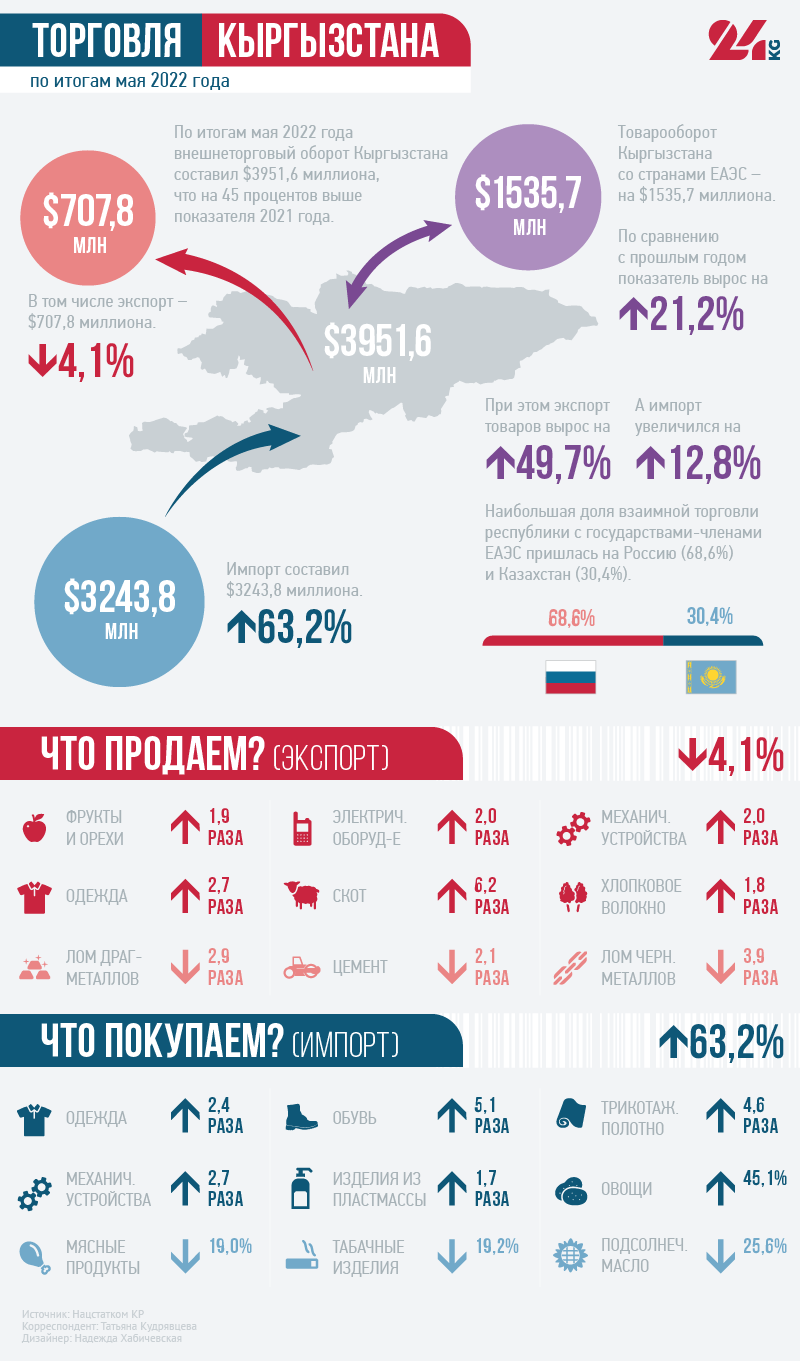 По итогам мая этого года внешнеторговый оборот Кыргызстана составил $3 миллиарда 951,6 миллиона, что на 45 процентов выше показателя 2021-го. Экспорт — $707,8 миллиона (падение на 4,1 процента), импорт — $3 миллиарда 243,8 миллиона (рост на 63,2 процента).
