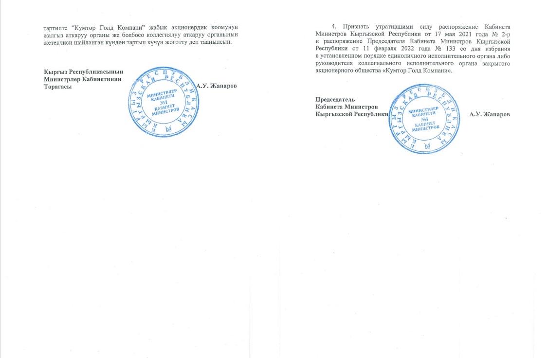Председатель кабинета министров Акылбек Жапаров подписал распоряжение, согласно которому на месторождении Кумтор прекращается режим внешнего управления. Об этом сообщает ЗАО «Кумтор голд компани».