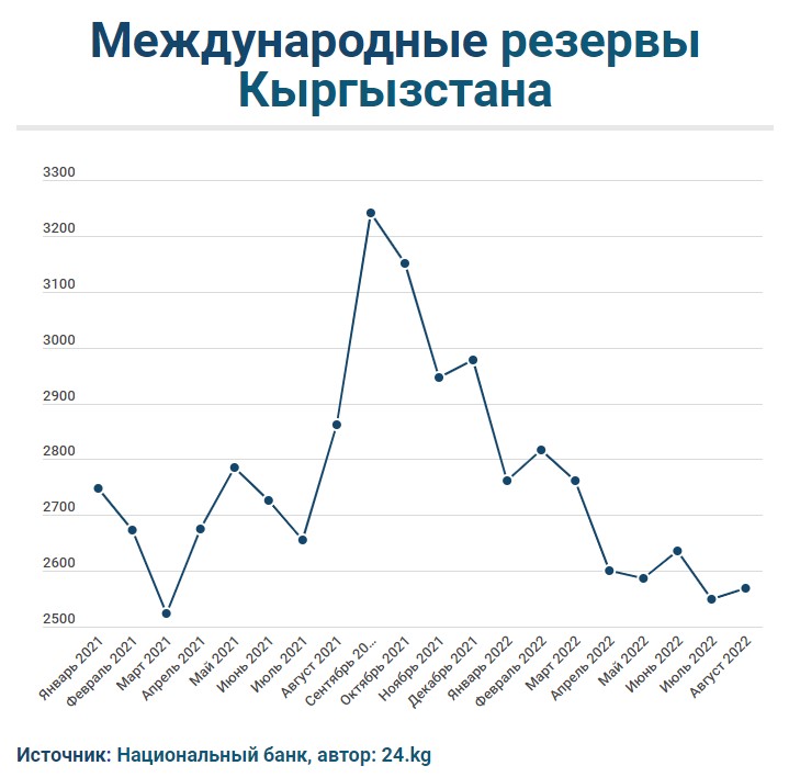 По итогам августа 2022-го валовые международные резервы Кыргызстана достигли $2 миллиардов 567,82 миллиона. Об этом сообщил сайт Национального банка.