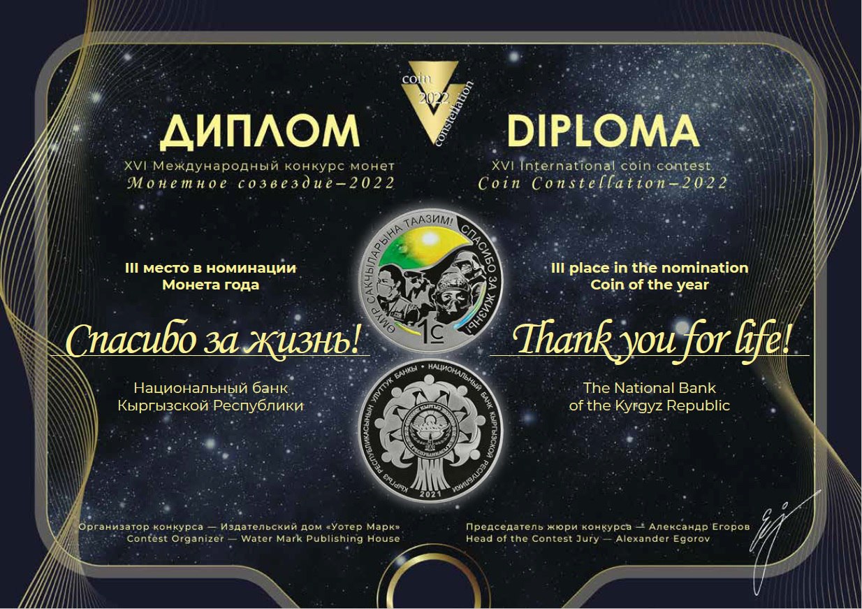 Коллекционная монета «Спасибо за жизнь!» заняла третье место в номинации «Монета года» в престижном Международном конкурсе «Монетное созвездие — 2022». Об этом сообщает пресс-служба Национального банка.
