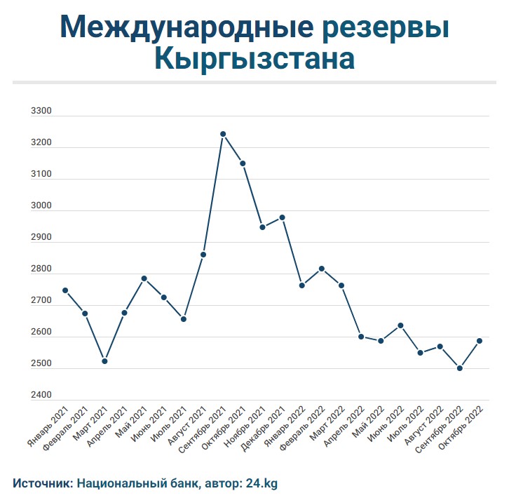 По итогам октября 2022 года валовые международные резервы Кыргызстана достигли $2 миллиардов 587,08 миллиона. Об этом сообщил сайт Национального банка.
