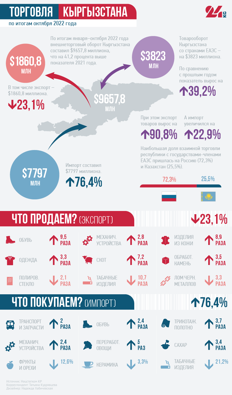 По итогам января — октября 2022 года внешнеторговый оборот Кыргызстана составил $9 миллиардов 657,8 миллиона, что на 41,2 процента выше показателя 2021-го. Экспорт — $1 миллиард 860,8 миллиона (падение на 23,1 процента), импорт — $7 миллиардов 797 миллионов (рост на 76,4 процента).