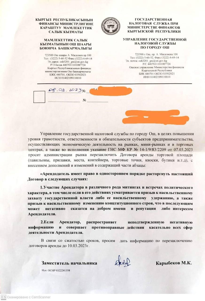 Налоговая служба разослала всем владельцам рынков письмо с просьбой перезаключить договоры аренды с предпринимателями на новых условиях. Фото писем распространяют в социальных сетях.