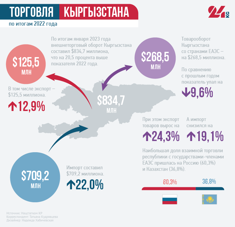 По итогам января 2023 года внешнеторговый оборот Кыргызстана составил $834,7 миллиона, что на 20,5 процента выше показателя 2022-го. Экспорт — $125,5 миллиона (рост на 12,9 процента), импорт — $709,2 миллиона (рост на 22 процента).