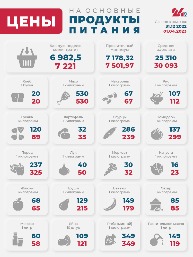 Мы еженедельно ходим в один и тот же супермаркет и отслеживаем цены на один и тот же набор продуктов. Анализ показывает, что по сравнению с первым кварталом 2022 года стоимость нашей продуктовой корзины выросла на 577 сомов.