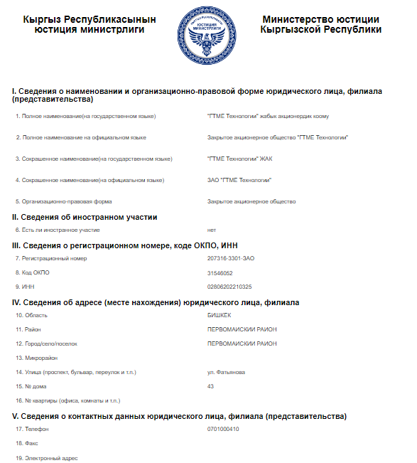 В прошлом году ЗАО «ГТМЭ Технологии» оплатило в казну государства 7 миллионов 847,8 тысячи сомов налогов и платежей. Это были уплата налога на прибыль, подоходного и социальные отчисления. С начала 2023-го в казну государства от компании поступило 7,4 миллиона сомов налогов и платежей. Их структура осталась прежней. Никаких данных об уплате таможенных пошлин при импорте товаров нет.