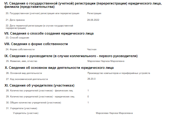 Создано в июне прошлого года в Первомайском районе столицы. Компания занимается производством компьютеров и периферийных устройств. Учредителем и руководителем фирмы числится Наргиза Марселевна Марселева. Она также является руководителем или учредителем компаний «Пронова» и юридической «Закон и бизнес».