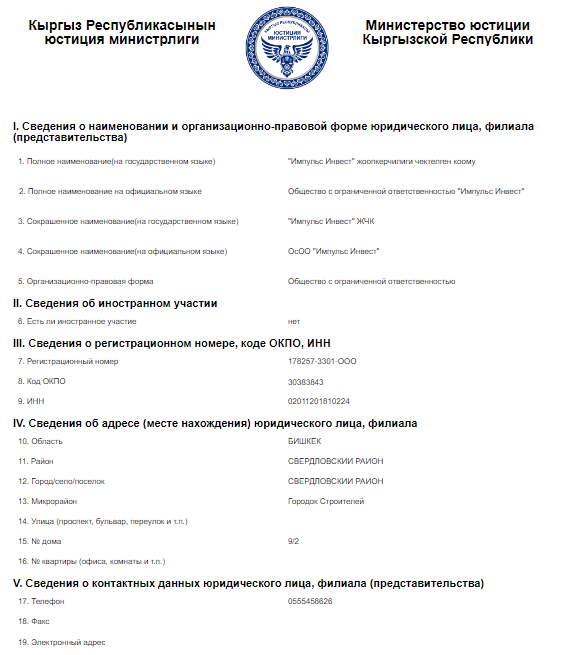 Согласно базе данных Министерства юстиции, ОсОО «Импульс Инвест» создано в январе 2021-го в Свердловском районе столицы. Его руководителем и учредителем является Радик Бадавилович Насрединов.