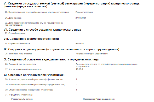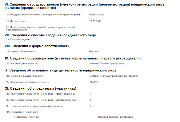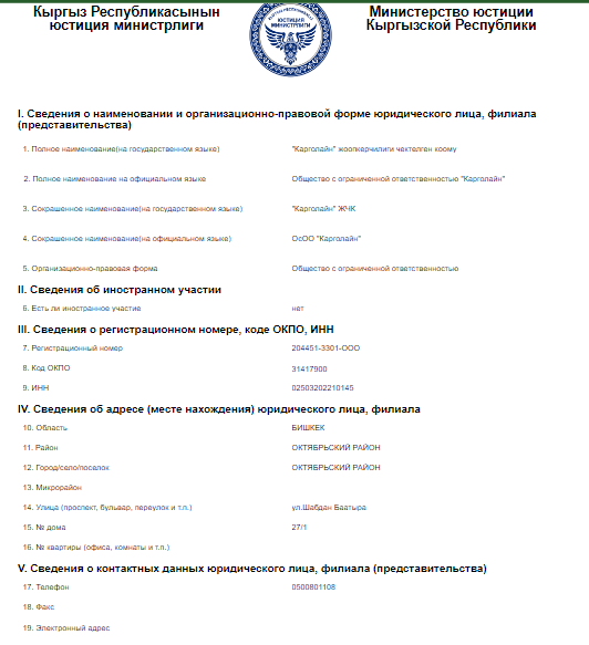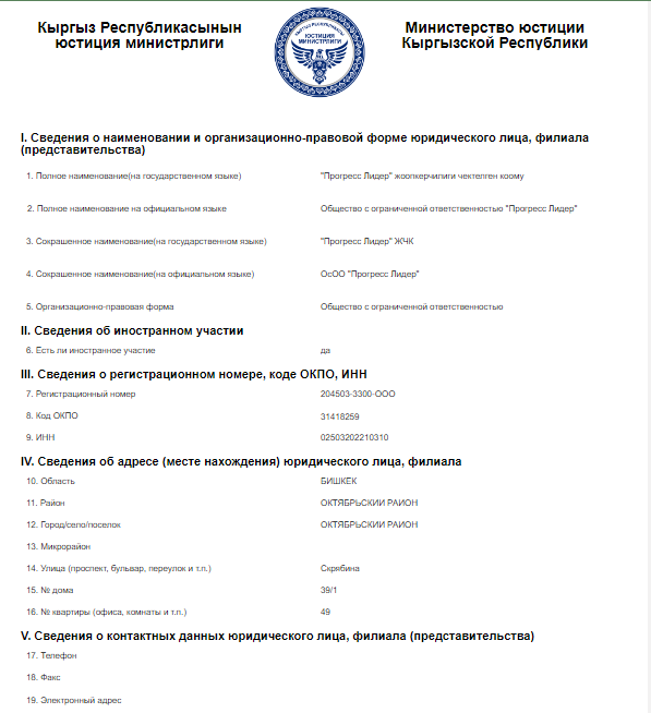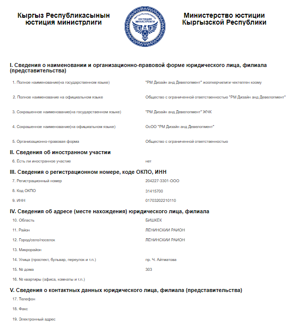 Создано в марте 2022-го в Октябрьском районе Бишкека. Его руководителем и учредителем является Татьяна Григорьевна Иванова. Официально ОсОО занимается оптовой неспециализированной торговлей.