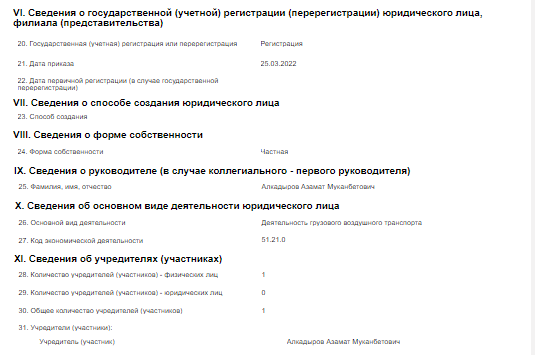 Зарегистрировано в марте 2022 года в Октябрьском районе Бишкека. Основной вид деятельности — сфера грузового воздушного транспорта. Руководителем и учредителем указан Азамат Муканбетович Алкадыров. Он также числится владельцем и руководителем еще одного ОсОО — «Аэротрейд». Сфера деятельности этого предприятия аналогична «Карголайну».