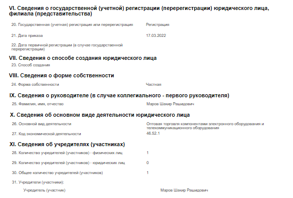 Компания прошла регистрацию в марте 2022-го в свободной экономической зоне «Бишкек». Ее руководителем и учредителем является Шакир Рашидович Маров. Официально ОсОО занимается оптовой торговлей компонентами электронного и телекоммуникационного оборудования.