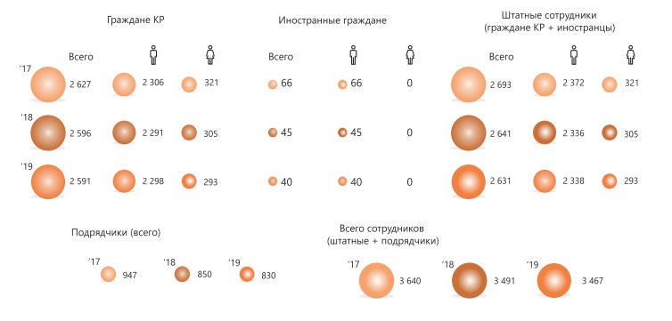 С 2017 года на предприятии взяли курс на сокращение расходов на производство золота. В том числе постепенно сокращали штат, чтобы снизить административные расходы. В итоге в 2019 году на Кумторе работало 3 тысячи 467 человек: 2 тысячи 637 штатных сотрудников и 830 представителей подрядных организаций. Число сотрудников уменьшилось на 173 человека, в том числе подрядчиков сократили на 117 человек.