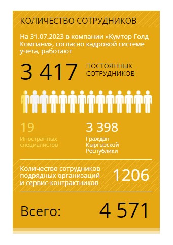 Если по итогам 2019 года на Кумторе было 3 тысячи 467 сотрудников, то к 2023-му их число выросло до 4 тысяч 623. В том числе сотрудники самого ЗАО «Кумтор Голд Компании» составляют 3 тысячи 417 человек, подрядных организаций — 1 тысяча 206. В 2019 году их было 2 тысячи 637 штатных и 830 подрядчиков.