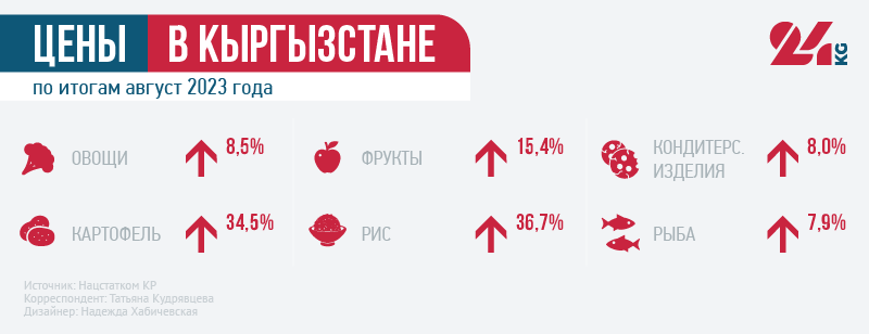 По итогам августа повышение цен отмечено во всех регионах Кыргызстана. Исключение составили Нарынская область и Бишкек, где цены снизились на 0,5 и 0,2 процента. Кроме того, в Таласской и Чуйской областях стоимость снизилась на 0,1 процента.